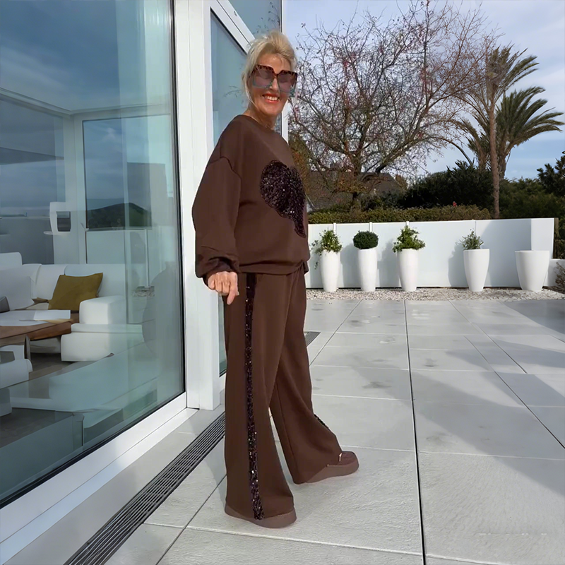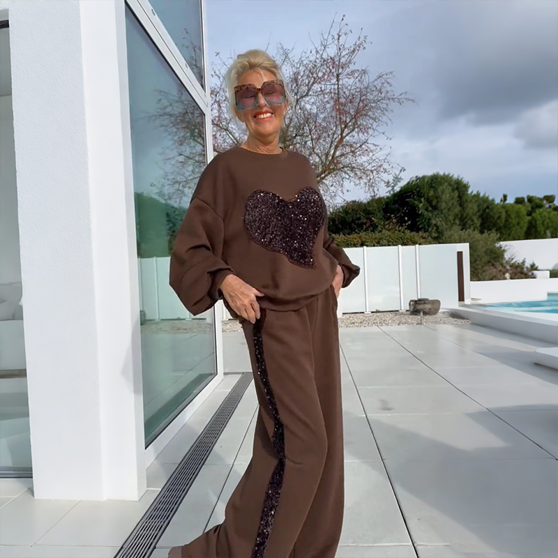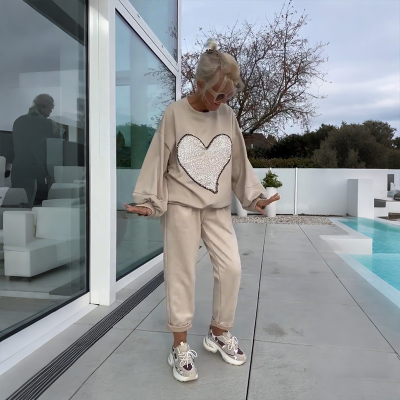 Emily Hart — “Absolutely love this set! The sequin heart is even prettier in person – really adds a chic little touch. The fit is relaxed without looking baggy. Super soft fabric too. Wore it out for coffee and got compliments straight away.”