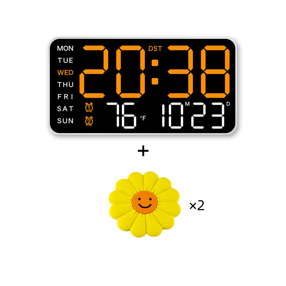 Large LED display shows time, date, day of the week and indoor temperature . Everything you need, clear and easy to read.